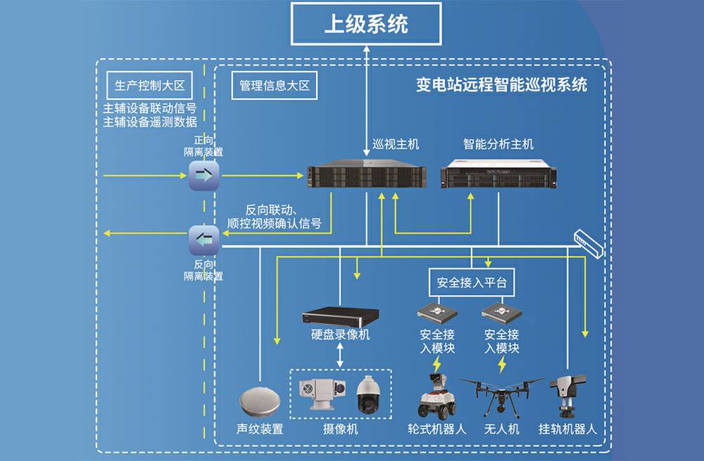 远程智能巡视系统获取主辅设备监控系统监测数据,整合主辅设备监控信息,从而实现主辅设备与巡视系统联动功能: (1)实现主设备SCADA监控系统变位信号和保护告警信号联动; (2)实现与辅控系统天气、消防、安防、门禁等状态联动功能; (3)实现与一键顺控系统联动功能。