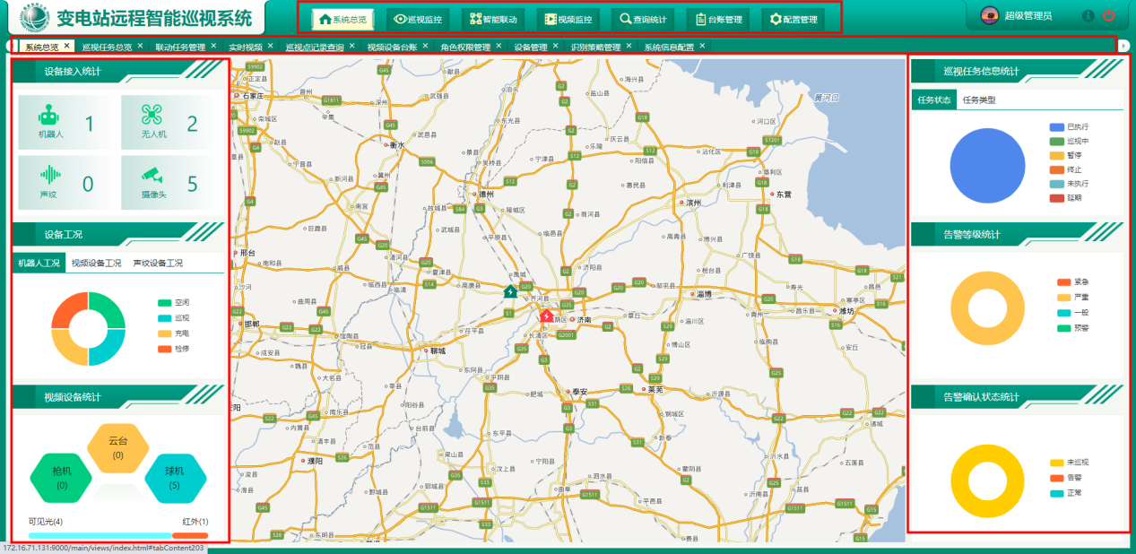 变电站远程智能巡视系统通过各类高清摄像机和室内外巡检机器人对现场巡视点位进行抓图和视频录制,利用人工智能图像识别技术,对设备、人员、环境、缺陷等进行智能化分析判断,从而实现变电站的智能化远程巡视。